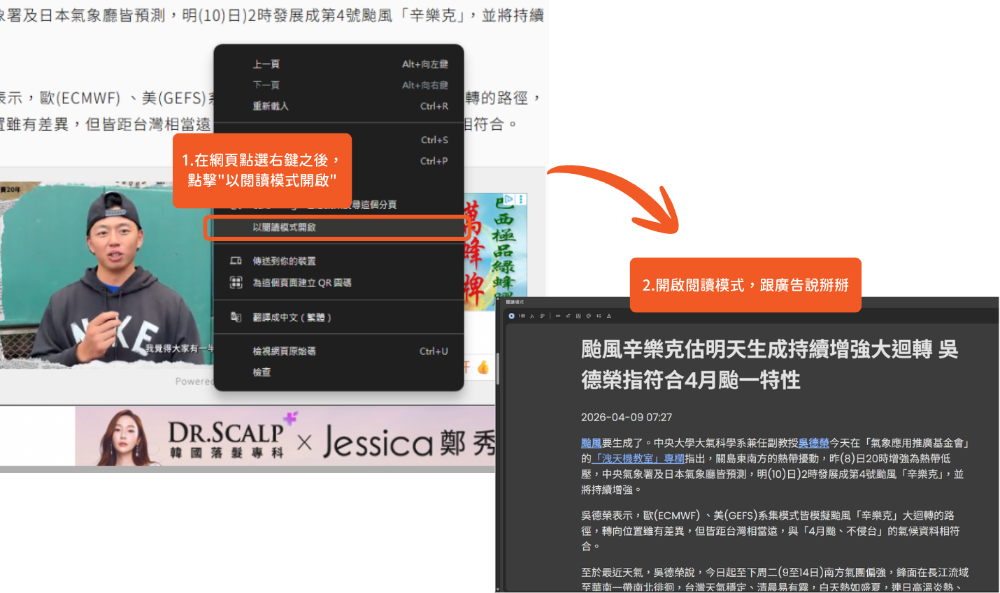 順便介紹一下「閱讀模式」功能,幫你擋掉畫面上的視覺干擾:平常打開長篇文章,常會遇到廣告或複雜的側邊選單。現在只要對著網頁點擊右鍵並開啟閱讀模式,畫面上的多餘元素全都會消失,只會留下乾淨的文字排版。當你需要專心讀完一份長篇的文件時,不用再手動關閉那些跳出來的視窗,目光可以直接順著文字往下讀。