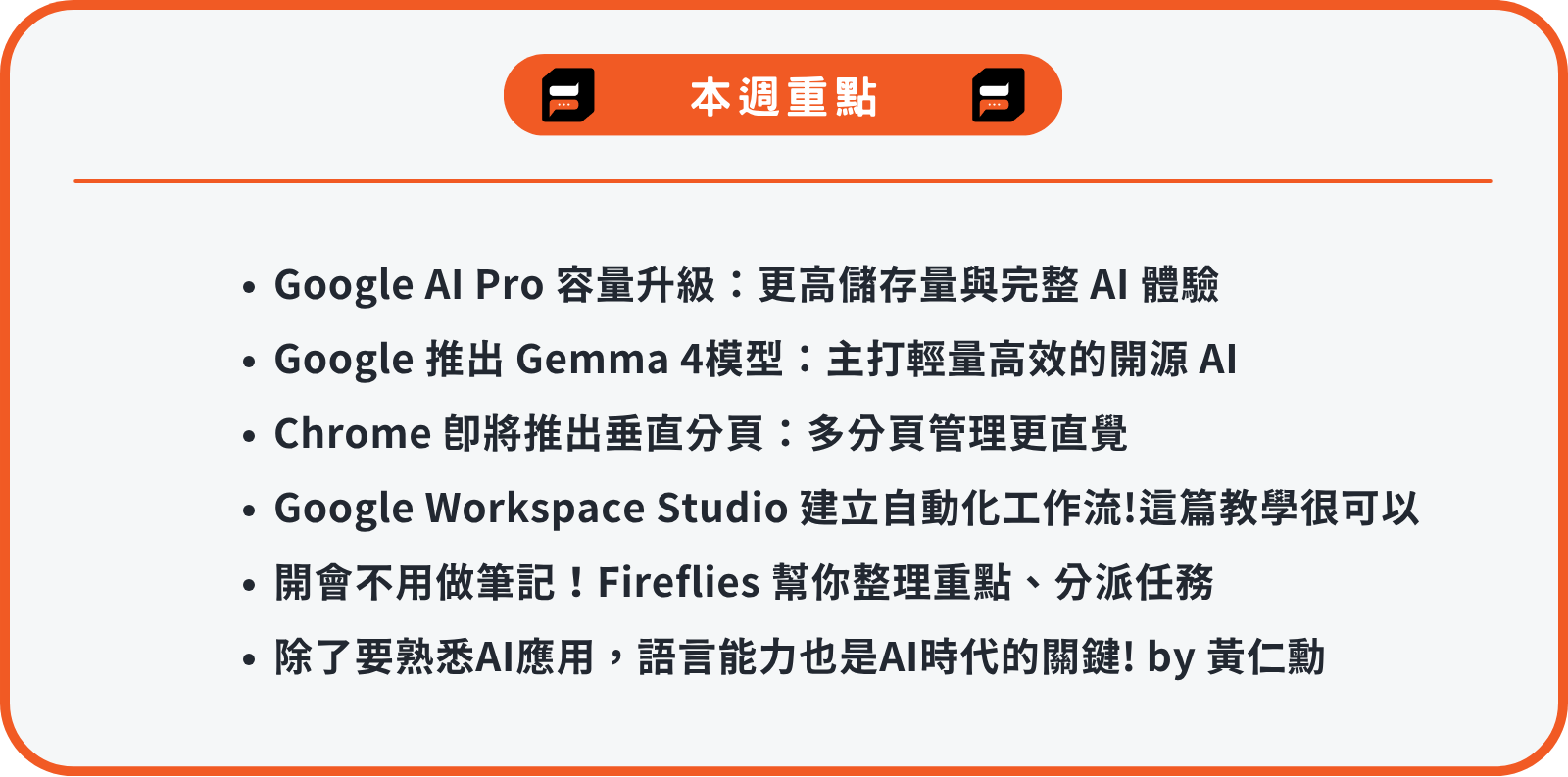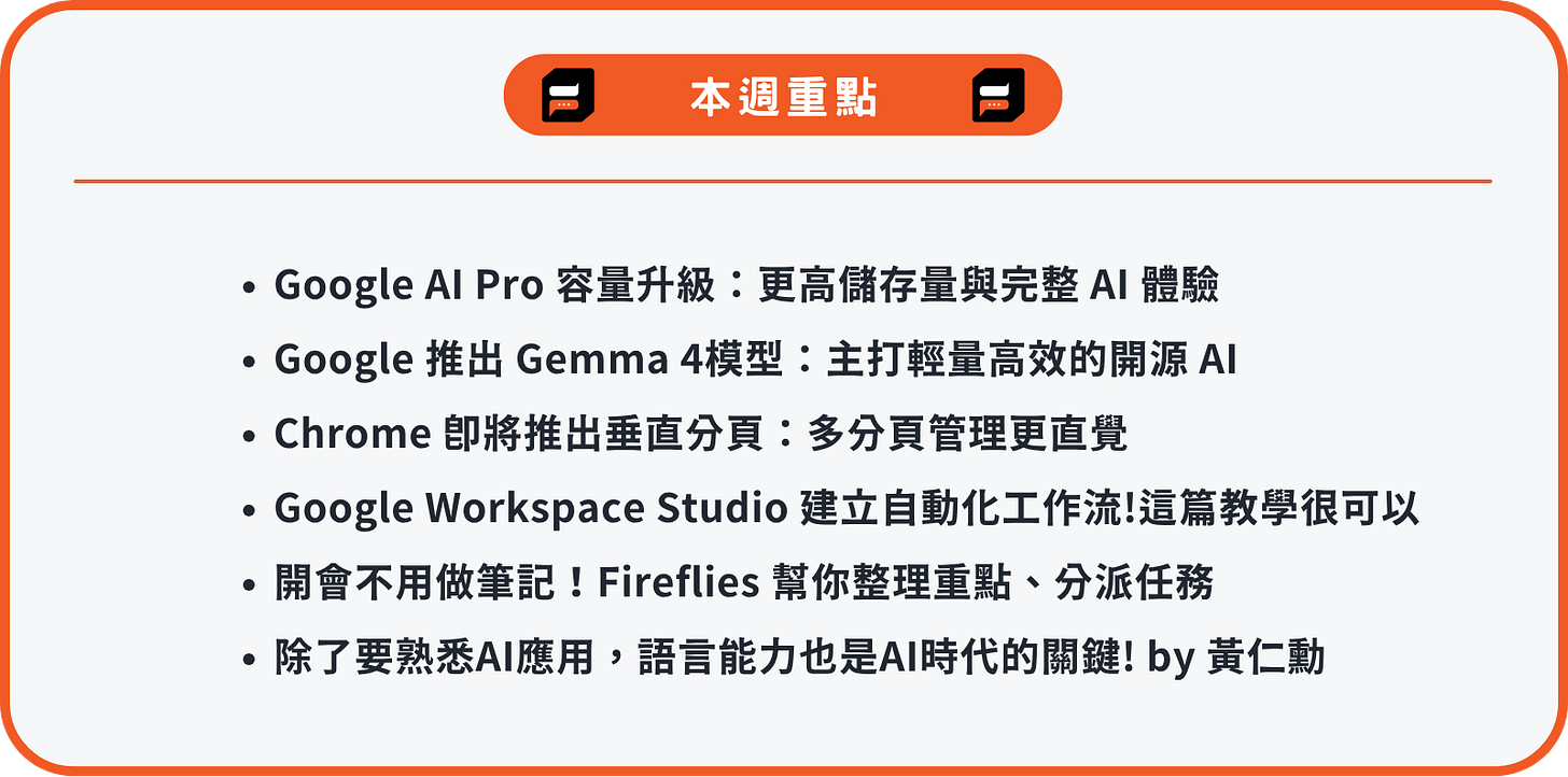 快訊:Google AI Pro 容量升級、Gemma 4 開源模型登場、Chrome 推出垂直分頁、Workspace Studio AI 自動化推薦教學、Fireflies 會議筆記助理