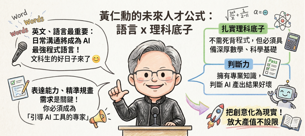 黃仁勳更直言,未來的頂尖人才如果不用這些 AI 工具來大幅放大自己的產值,就像晶片設計師堅持用紙筆畫圖一樣不合理。擁有扎實的理科底子,同時懂得「溝通與引導 AI 工具的藝術」,人人都可以把自己腦內的創意化為現實!