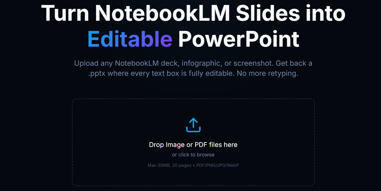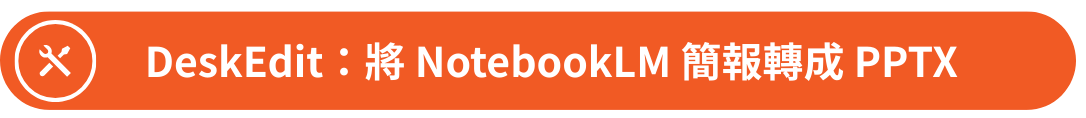 目前 NotebookLM 生成簡報的效果最好, 但只能輸出 PDF 檔案, 若需要編輯簡報內容, 就需要轉換成可編輯的 PPTX 格式。