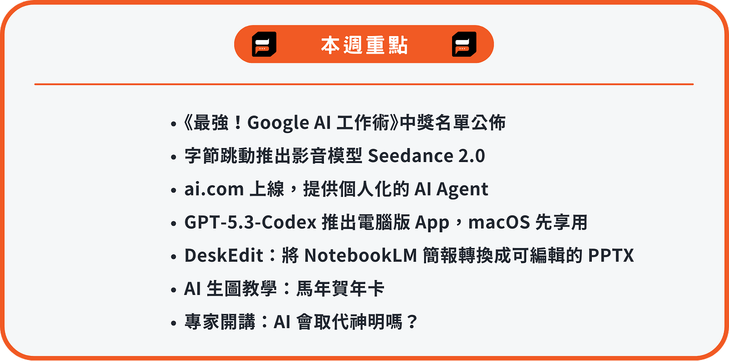 快訊:抽獎名單公佈、電影般的影音模型Seedance 2.0、個人AI代理人ai.com、Codex電腦版App、NotebookLM簡報轉ptt工具、馬年賀年卡生圖教學、AI會取代神明嗎?