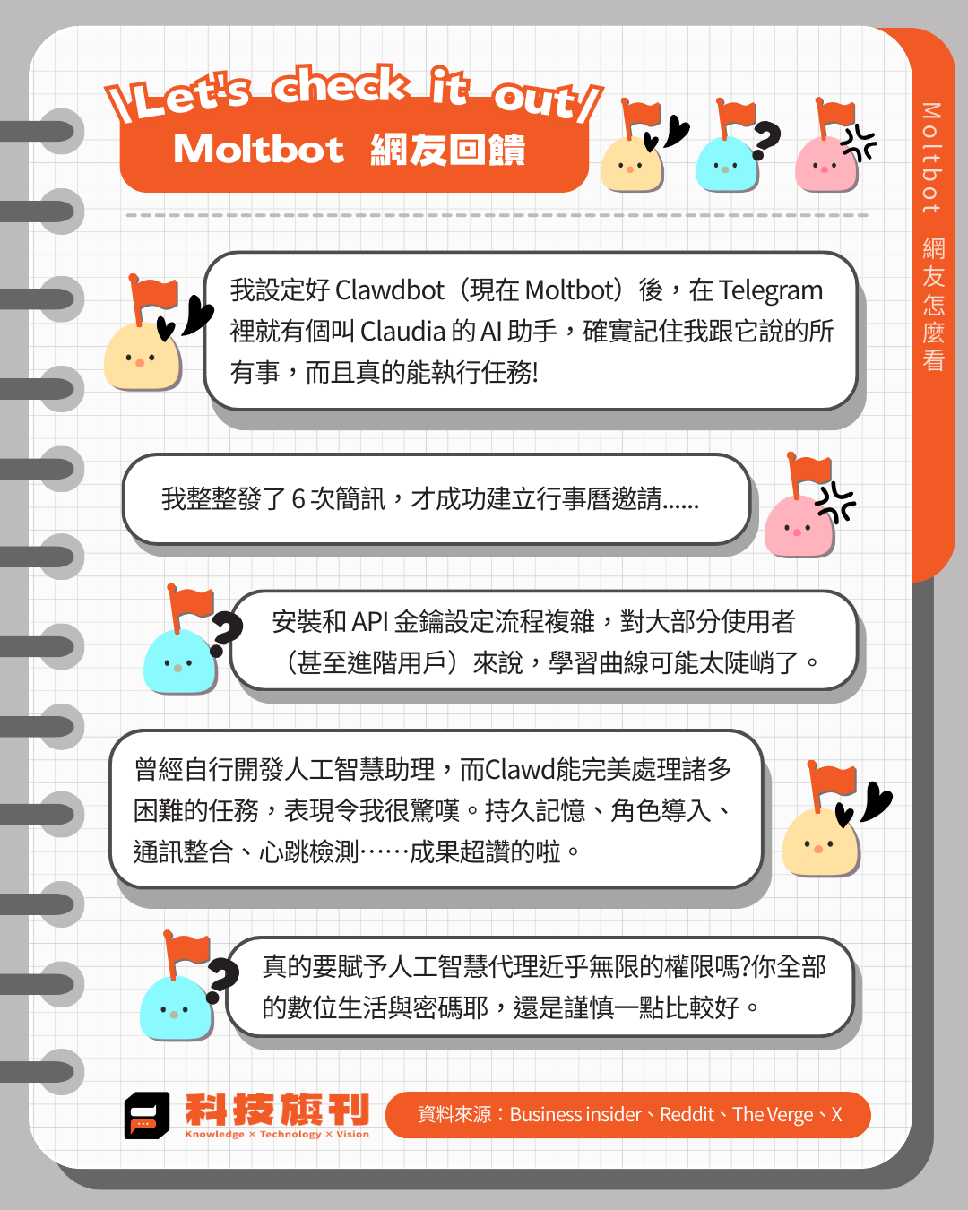 關於這個新工具目前網路上的評價褒貶不一。有人讚賞Moltbot的便利性,有人認為建置過程過於複雜,也有人反應這位代理龍蝦好像還不太聰明耶,另外還存在安全疑慮……