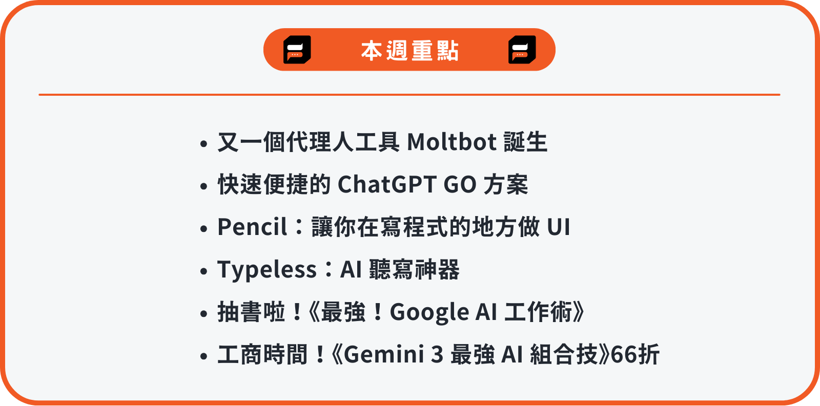 快訊:文案小編適合的ChatGPT GO、聽寫神器Typeless、等同於把Figma放到IDE的工具Pencil、抽書《Google AI 工作術》