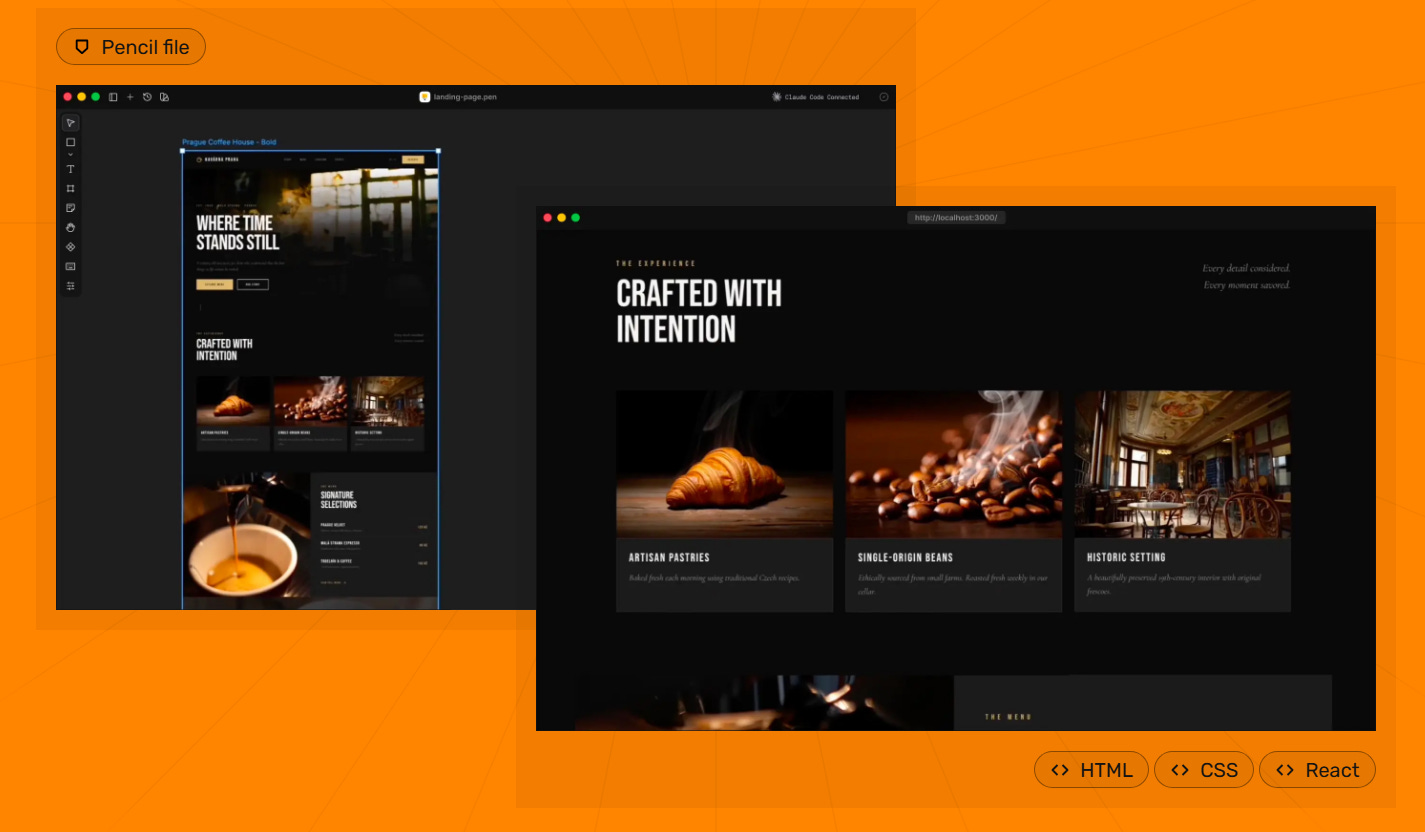 透過MCP協議,Pencil讓你在寫程式的軟體(如VS Code或Cursor)中,直接呼叫AI幫你畫圖。例如,只需要輸入「幫我做一個深色風格的咖啡店首頁」,AI就會在畫布上生成設計稿,而且它不只是產生圖片,這些設計還可以直接轉換成程式碼如HTML、CSS、React,讓設計與實作零時差。